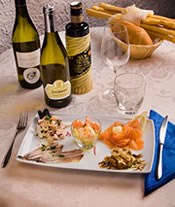 Composizione di 5 antipasti composti da insalata di mare, alici marinate, cocktail di gamberi, salmone affumicato di nostra produzione, couscous di verdure e calamari scottati alla grglia. Gli antipasi possono variare a seconda della stagione e della disponibilità del pesce.